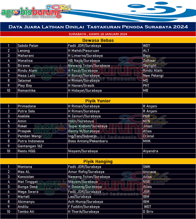 Di kelas piyik yunior, duet jawara gress milik H Riman Primadona dan Putra Solo yang sama sama bergelang R Anjani merebut posisi satu dan dua, kemenangan ini jelas menjadi acuan bahwa ditahun 2024 ini tim Tommi Surabaya milik H Riman akan semakin aktif di lomba. Dan di posisi ketiga direbut Aelole bergelang PGR
