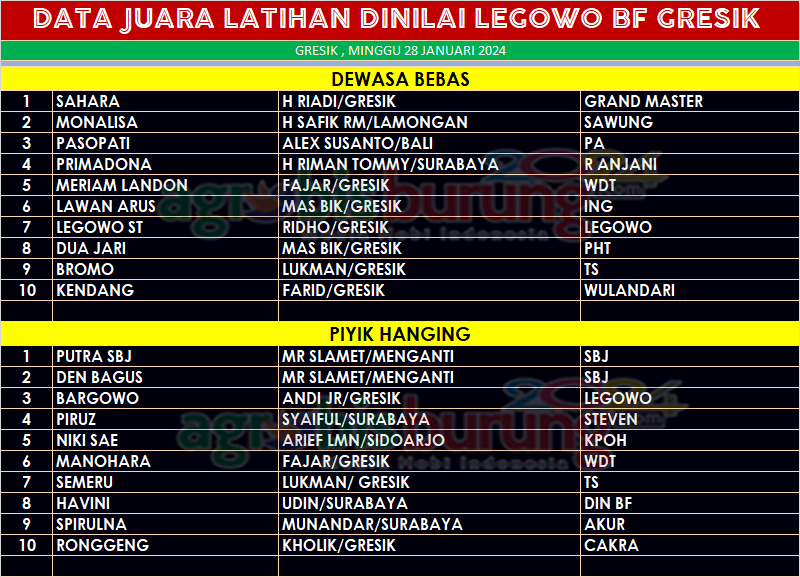 Sementara itu dua kelas yang dimainkan menghasilkan para juara terbaik, di dewasa bebas Sahara bergelang Grand Master milik H Riadi/H Safik Gresik tampkanya masih perkasa dan mampu tampil keren untuk merebut podium pertama. Sahara mampu meladeni perlawanan Monalisa bergelang Sawung dan Pasopati bergelang PA yang diakhir latihan dinilai menyerah di posisi kedua dan ketiga.