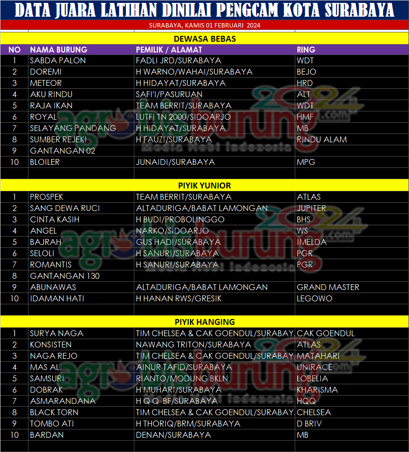 Di kelas piyik yunior, jawara muda Prospek bergealng Atlas milik Team Berrit Surabaya mencuri posisi pertama setelah unggul atas Sang Dewa Rudci bergelang Jupiter dan Cita Kasih bergelang BHS . Dan di kelas piyik hanging jawara Suryanaga bergelang Cak Goendul Surabaya menjadi yang terbaik pertama setelah dengan telak mengalahkan lawan lawannya. AB-END