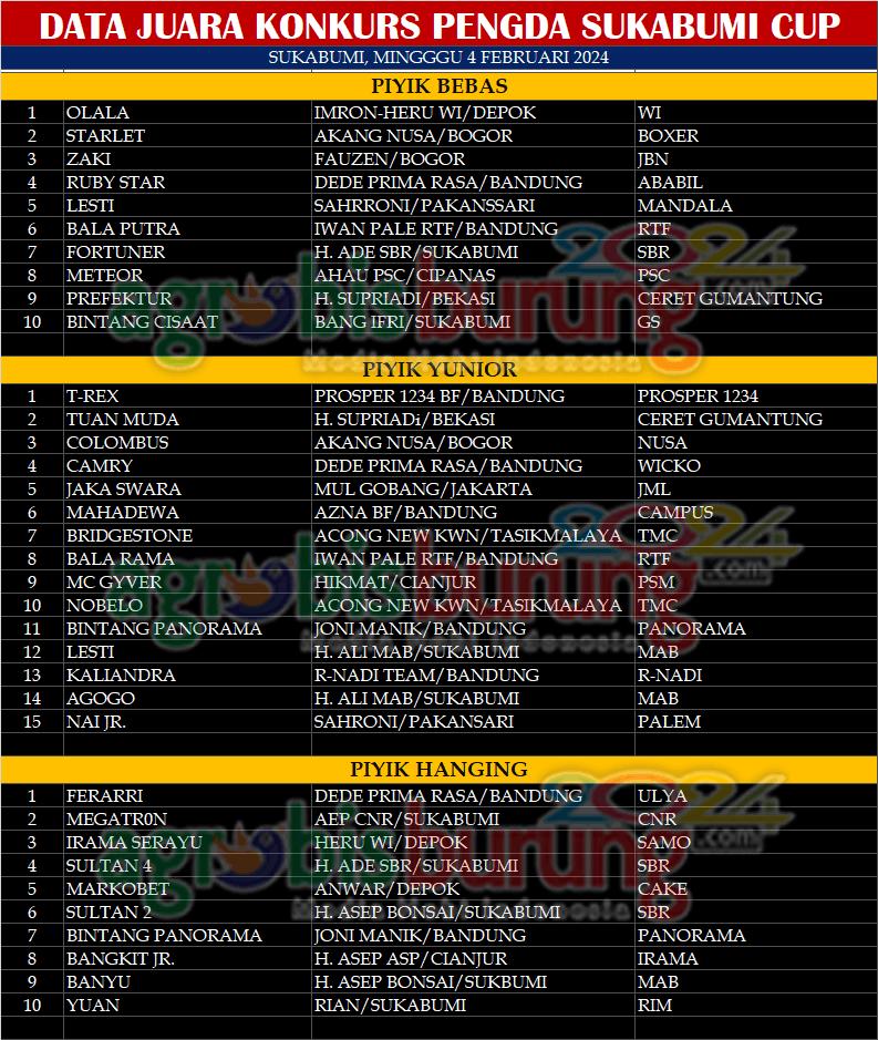 Di kelas piyik yunior, T-Rex andalan anyar Prosper 1234 Team Bandung yang baru diboyong usai digembleng di blok Timur, membuktikan kualitasnya di kelas kerekan setengah tiang. Adik dari Naga Bonar ini mampu melewati ketatnya persaingan di kelas yang diikuti 2 blok peserta. T-Rex menyisihkan pesaing beratmya, diantaranya Tuan Muda (CG) andalan H. Supriadi Ceret Gumantung Bekasi dan Colombus (Nusa) milik Akang Nusa Bogor.