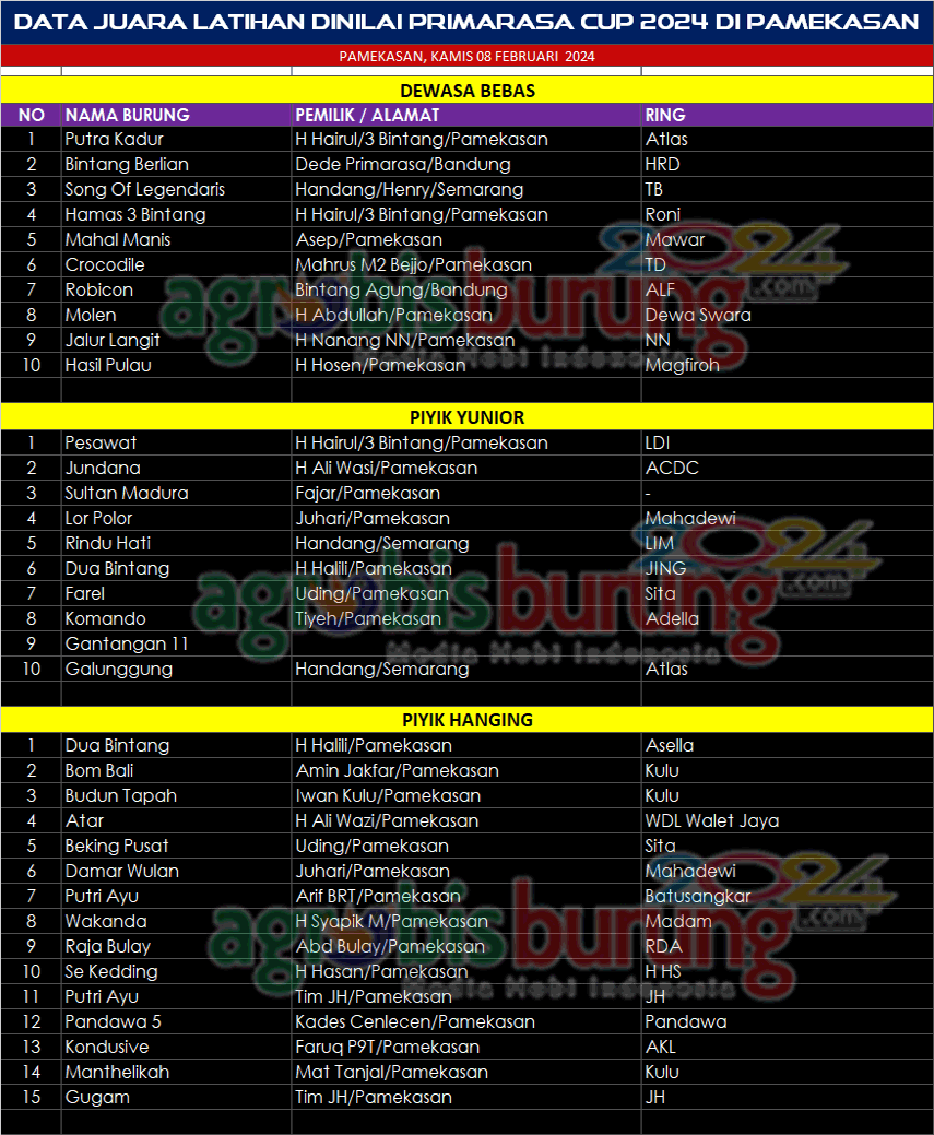 Sementara itu dari 3 kelas yang dimainkan tampaknya menjadi pembuktian jago jago handal untuk menghadapi musim konkurs 2024, di dewasa bebas jawara Putra Kadur bergelang Atlas milik H Hairul 3 Bintang tampaknya mengawali debut 2024 dengan mantap dan tampil joss merebut pdoium pertama. Bintang Berlian bergelang HRD menyusul diposisi kedua dan Song Of Legendaris dipodium ketiga.