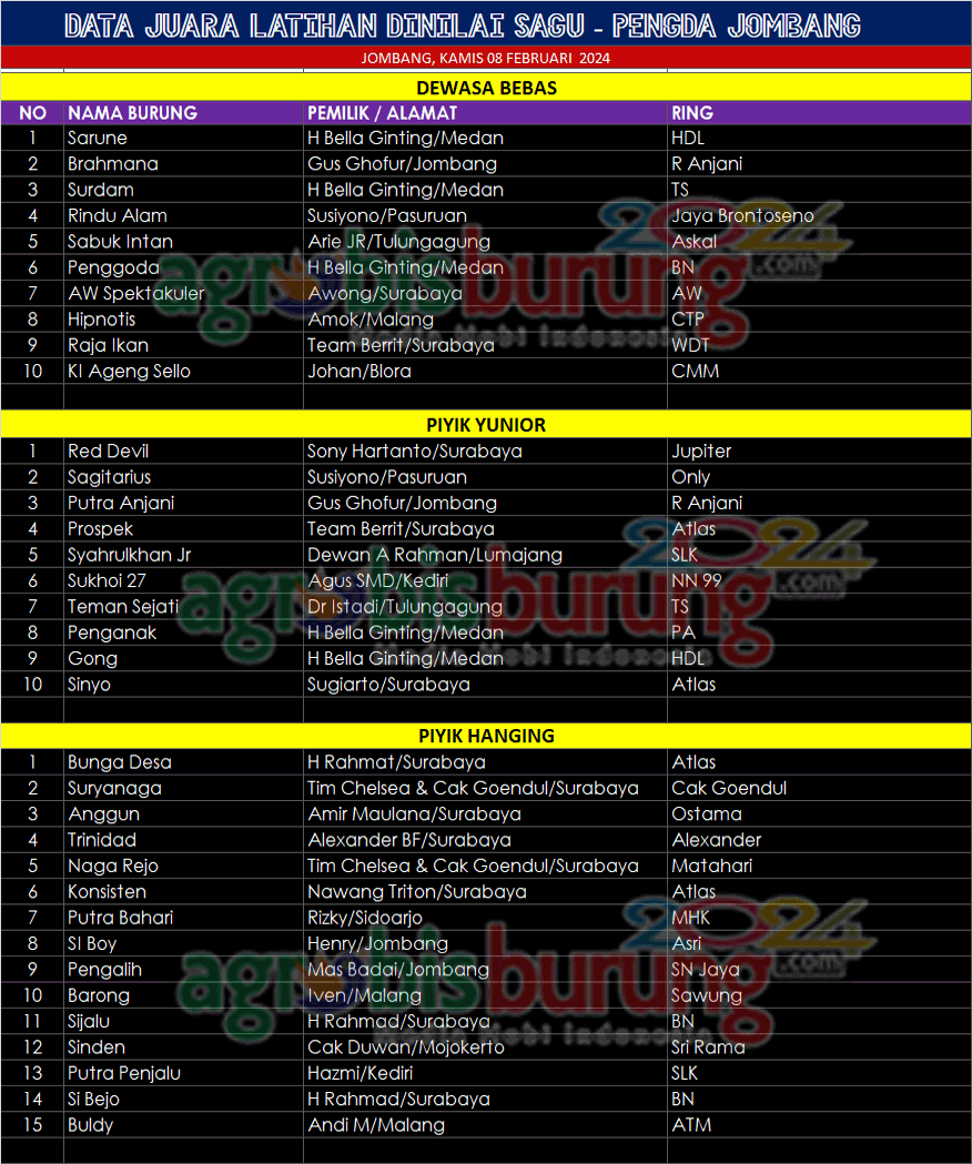 JOMBANG, agrobisburung.com – Latihan dinilai di Lap. Sagu BF Jombang pada Kamis (08/02) menjadi agenda menarik dan seru, pasalnya sederetan burung burung nasional turun di latihan tersebut yang dikawal beberapa tokoh perkutut. Toni Dhetira, ketua pengda Jombang mengatakan bahwa di latihan perdana di tahun 2024 ini memang menarik karena beberapa jawara nasional turut hadir untuk meramaikan hajat pengda Jombang. “Kita memang akan merutinkan agenda latihan dinilai menyesuaikan jadwal yang sudah ada dan selain di Sagu kita juga ada di beberapa lokasi dan kami atas nama kru panitia juga mengucapkan terima kasih kepada Abah Samsul Sagu atas dukungannya dalam gelaran rutin tersebut. Terima kasih juga kepada kungmania yang sudah hadir dan selamat kepada para pemenang,”ucap Tony Dhetira