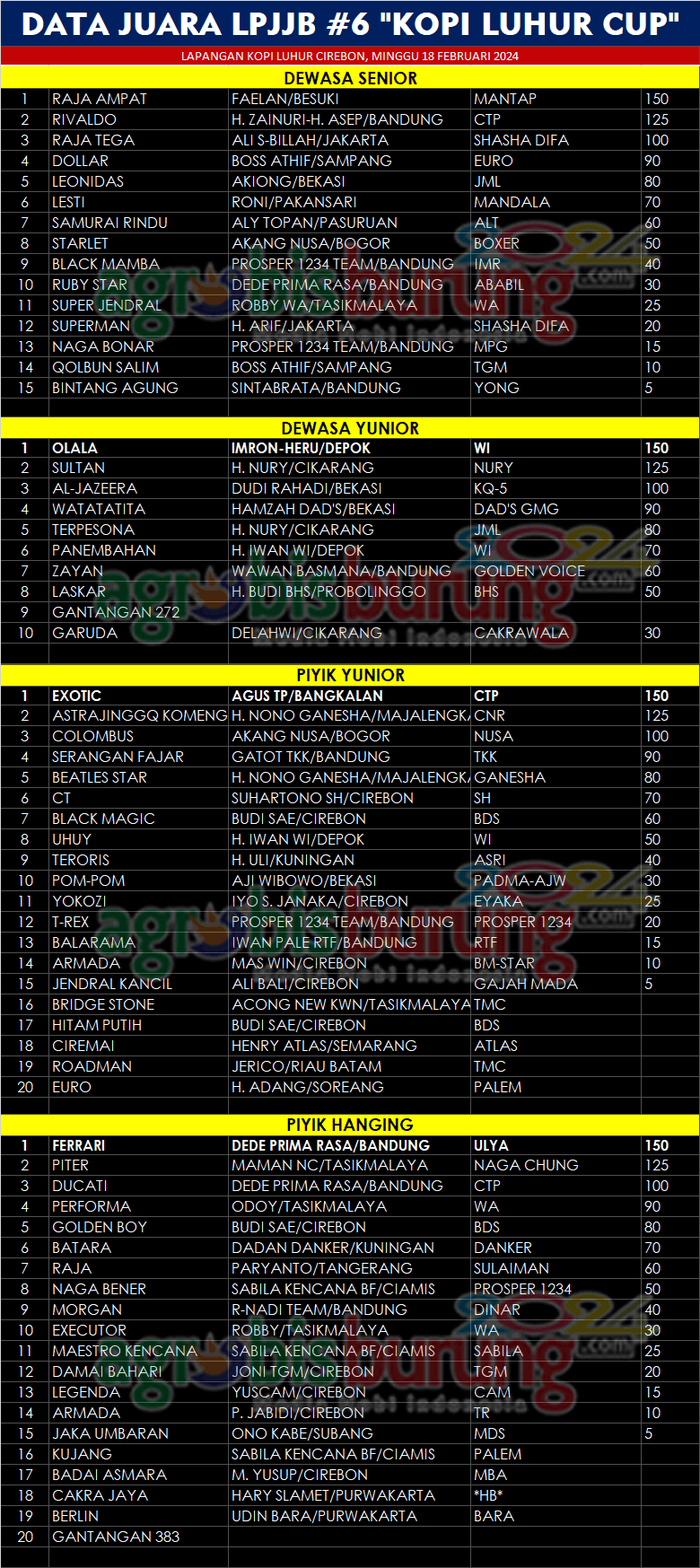 Headline Hobi Burung Juara Organizer Perkutut Perkutut Profil Tokoh Data Juara LP. JJB # 6 Kopi Luhur Cup 2024 DI Cirebon, Minggu 18 Februari agrobisburung 18 Februari 2024 CIREBON, agrobisburung.com – Data Juara LP. JJB # 6 Kopi Luhur Cup 2024 DI Cirebon, Minggu 18 Februari Tinggalkan Komentar Post navigation Previous: Putra Serena, Estepe & Kuncung Moncer Bareng di Latihan Dinilai Pengda BojonegoroNext: Lagi Lagi H Cholil Boyong Jawara Ciamik, Kali ini Soneta MIlik H Rochim Malang deal Rp. 150 Juta More Stories Headline Perkutut Profil Nunu Depok “Turun Gunung” Langsung Borong 5 Pasang K-Unggulan WAT BF Tasikmalaya, H. Pendi Nadira Jakarta Jebol K-WAT Brahmana & BDB BF Lombok Jebol K-WAT Raja Ampat agrobisburung 13 Januari 2026 Headline Juara Perkutut Jawara Bandar Jawa 1, Boxer & Joko Tarub Melejit ke Podium Utama Di Latihan Dinilai Pengcam Pengantenan Pamekasan agrobisburung 12 Januari 2026 Headline Juara Perkutut Jawara Gading Asmara & Cah Samin Berkuasa Dikelasnya di Latihan Dinila Pengda Bojonegoro agrobisburung 11 Januari 2026