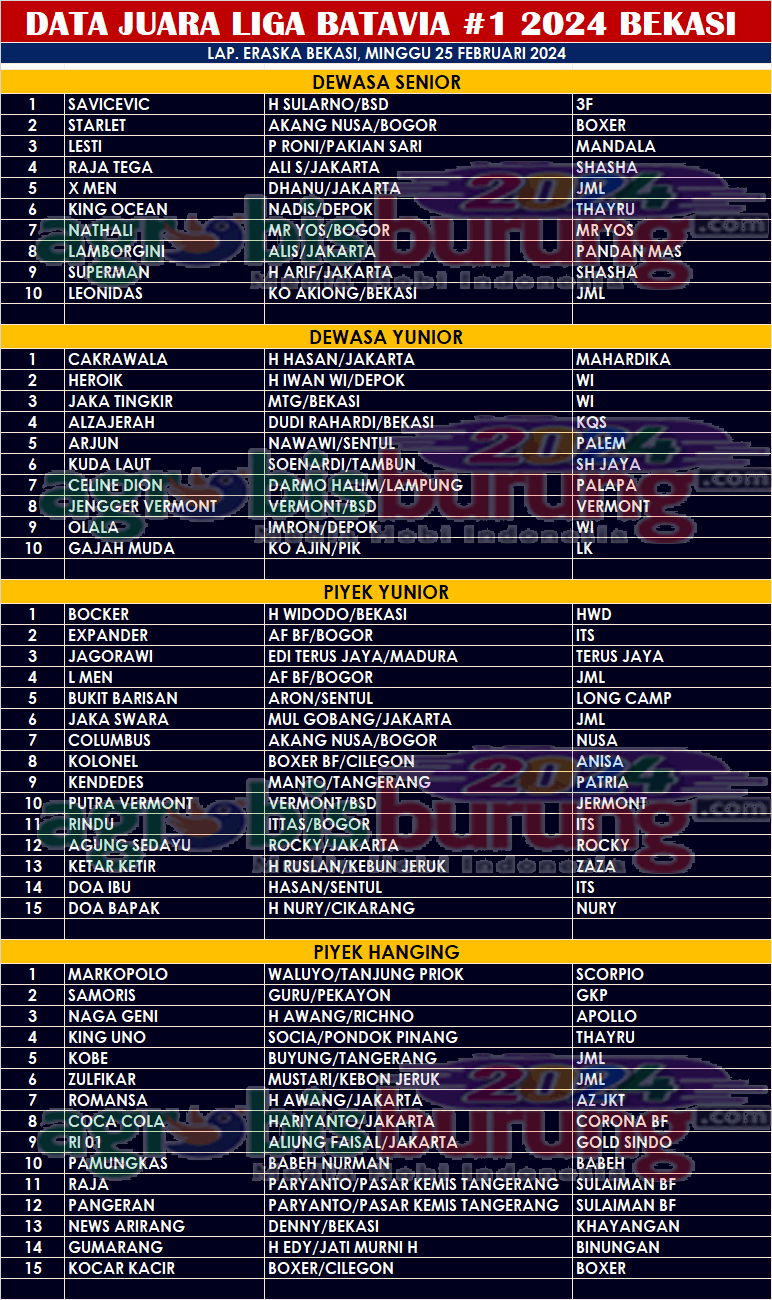 Data Juara Liga Perkutut Batavia 2024 Bekasi, Minggu 25 Februari