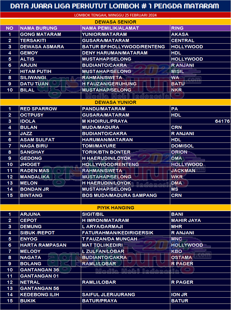 MATARAM – LOTENG, agrobisburung.com –  Data Juara Liga Perkutut Lombok # 1 Pengda Mataram Loteng, Minggu 25 Februari