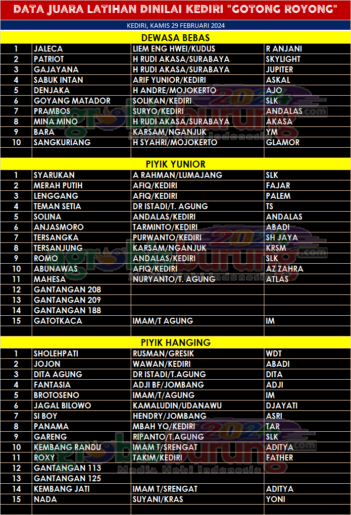 Di kelas piyik yunior, debutan muda Syarukan bergelang SLK milik A Rahman Lumajang yang juga tampil elegan akhirnya bisa merebut posisi pertama dari Merah Putih bergelang Fajar dan Lenggang bergelang Palem. Pertarungan Syarukan dengan duet jawara milik Afiq Kediri dimenangkan Syarukan diposisi pertama dan disusul keduanya. Dan di kelas piyik hanging yang jadi terbaik pertama di kelasnya adalah jawara Sholehpati bergelang WDT milik Rusman Fajar Gresik . AB-END