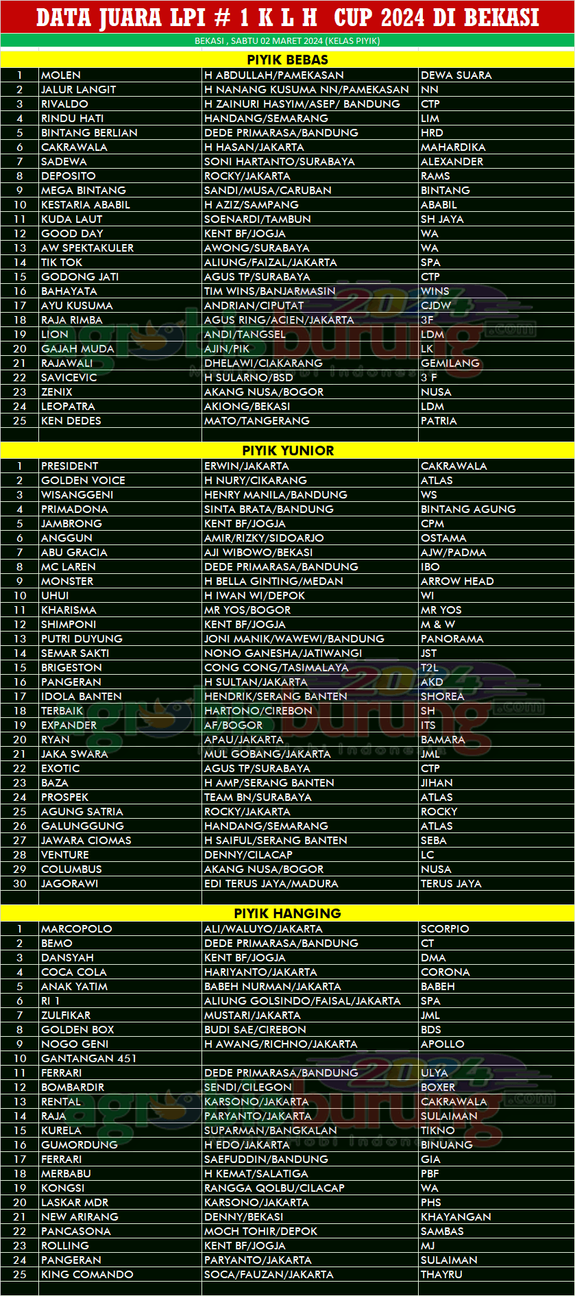 Di kelas piyik yunior, debutan muda bernama President bergelang Cakrawala milik Erwin Cakrawala juga memberikan kejutan, jawara yang memang digadang gadang moncer di LPI KLH benar benar bikin keder lawan lawannya. Golden Voice bergelang Atlas dan Wisanggeni bergelang WS yang bermain stabilpun kedororan pertahannya dan melepaskan President melejit diposisi pertama dan keduanya berada diposisi kedua dan ketiga.
