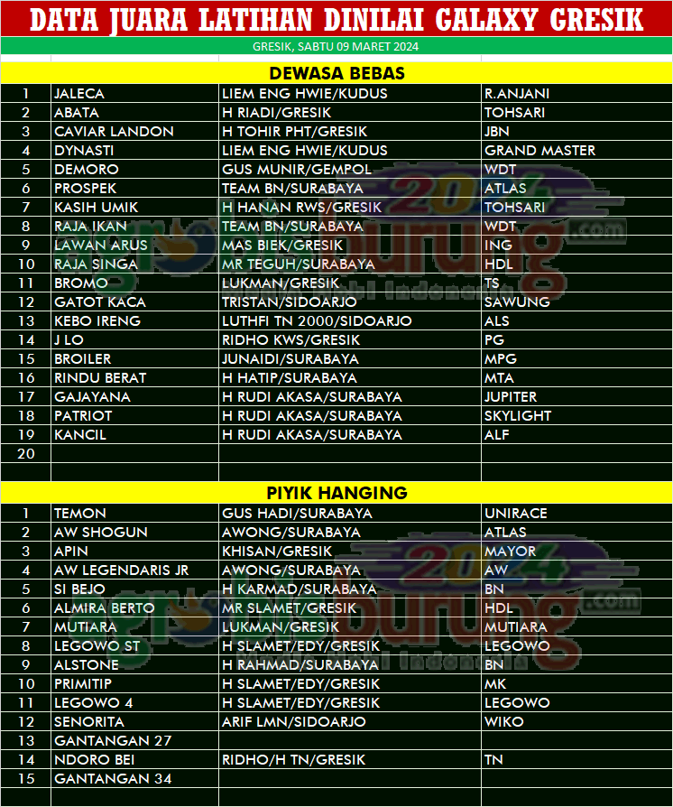 Di kelas piyik hanging, jawara belia Temon bergelang Unirace milik GUs Hadi Surabaya yang tampil terbaik langsung bertengger dipodium pertama, disusul Aw Shogun bergelang Atlas dan Apin bergelang Mayor yang menyusul posisi kedua dan ketiga. AB-END