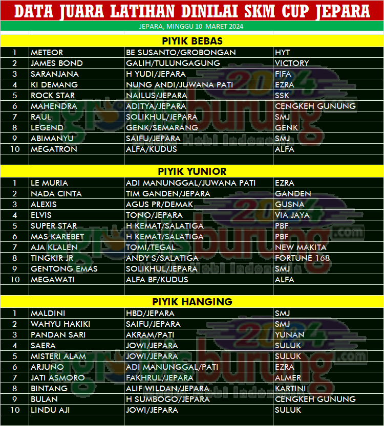 Dan di kelas piyik yunior, jawara Le Muria bergelang Ezra melejit dipodium pertama setelah di babak keempat perolehan nilainya sudah tidak mungkin tersalip oleh lawan lawannya. Dipodium kedua dan ketiga ditempati jawara Nada Cinta bergelang Ganden dan Alexis bergelang Gusna. Untuk di kelas piyik hanging yang jadi terbaik pertama direbut jawara belia Maldini bergelang SMJ milik HBD Jepara dan disusul Wahyu Hakiki dan Pandansari. AB-END