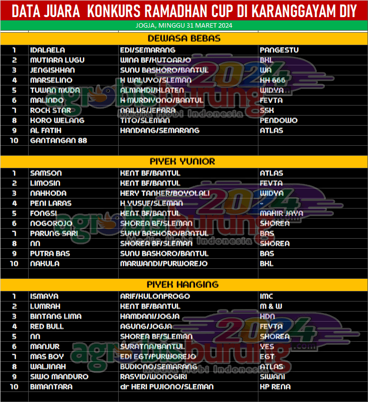 JOGJA, agrobisburung.com – Gelaran Ramadhan Cup yang digelar minggu (31/03) di lapangan Karanggayam Sleman berjalan sukses. Dari 210 tiket yang disediakan panitia hanya tersisa beberapa lembar saja , itupun sebenarnya sudah dipesan oleh kung mania, nanum karena ada kegiatan mendadak sehingga ada beberapa kung mania yang tidak bisa hadir. Susriyanto, ketua pengwil DIY mengatakan bahwa gelaran kali ini dikhususkan untuk THR an juri, sehingga semua hasil lomba kali ini seluruhnya dibagikan ke pada team yuri.