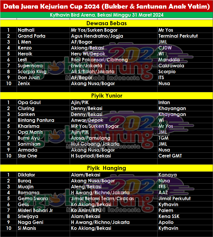BEKASI, agrobisburung.com – Gelaran Kejurian Cup 2023 yang di laksanakan pada Minggu (31/03) di Kythavin Bird Arena Kranggan Bekasi berlangsung meriah, apalagi gelaran yang bersamaan dengan bulan suci Ramadhan ini digelar mulai pukul 14.00 WIB sampai selesai. Abdul Majid, salah satu panitia mengatakan bahwa acara Kejurian Cup ini memang wadah berbagi untuk juri sambil berbuka bersama dalam suasana Ramdhan serta memberikan santunan kepasa Anak Yatim di seputaran Bekasi. ” Alhamdulillah semuanya berjalan lancar dan sukses dan terima kasih kepada semuanya yang sudah mendukung kegiatan Kejurian Cup, Bukber dan santunan untuk anak yatim. Semoga semuanya mendapat rahmad dari Allah SWT, aminnnn,”jelas Abdul Majid pada agrobisburung.com