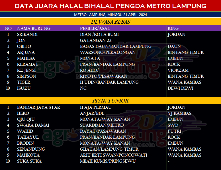 Sementara itu jalannya latihan dinilai memang sangat seru di dua kelas yang dimainkan, di dewasa bebas Srikandi bergelang Jordan milik Dian Kota Bumi menjadi yang terbaik pertama setelah unggul atas lawannya Jon dan Abito. Dan di kelas piyik yunior, jawara muda Bandar Jaya Star yang juga bergelang Jordan melejit di kelasnya meraih podium pertama, disusul Heru dan Qiu Qiu dipodium kedua dan ketiga. AB-END