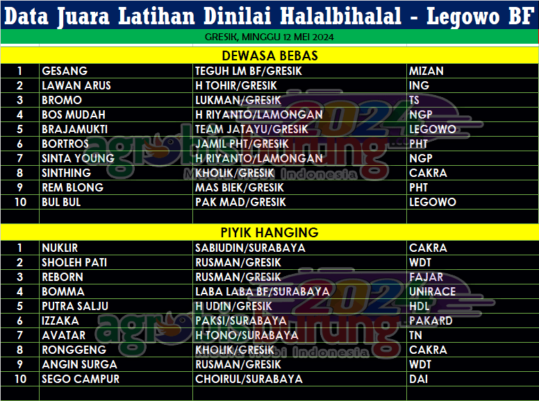 GRESIk, agrobisburung.com –  Latihan  dinilai Halal Bihalal pengda Gresik di markas Legowo BF pada Minggu (12/05) berjalan meriah, kungmania Gresik dan sekitarnya hadir bersilaturahmi meramaikannya. Sutayat, tuan rumah mengatakan bahwa agenda ini memang sudah dijadwalkan dan alhamddulillah pelaksaaanya meriah dan sukses.