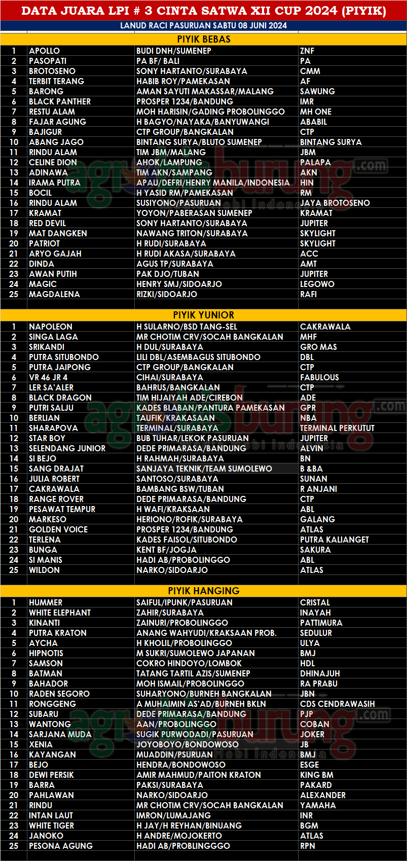 Data Juara Konkurs LPI # 3 Cinta Satwa Cup 2024 di Raci Pasuruan, Sabtu 08 Juni