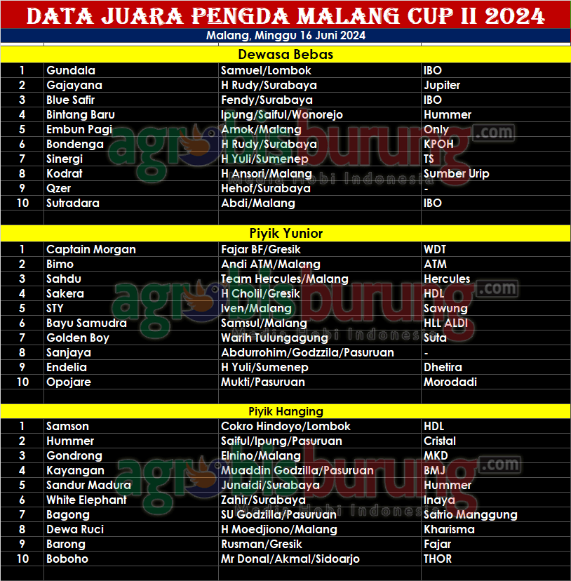 Dan di kelas piyik hanging yang jadi terbaik pertamanya adalah jawara belia Samson berlang HDL milik Cokro Hindoyo Lombok, posisi kedua Hummer milik Ipung/Saiful Pasuruan dan Gondrong milik Elnino diposisi ketiga.
