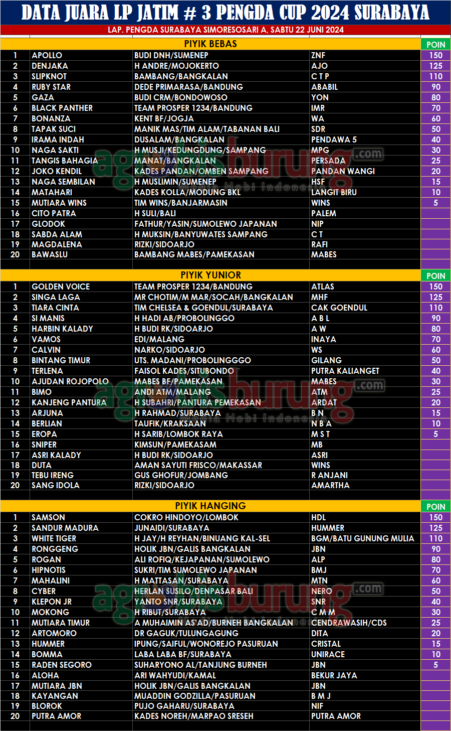 Untuk data juaranya lihat saja di hasil Data Juara LP. Jatim # 3 Pengda Surabaya Cup 2024, Sabtu 22 Juni (PIYIK) di bawah ini beserta poin LP. Jatim 2024.