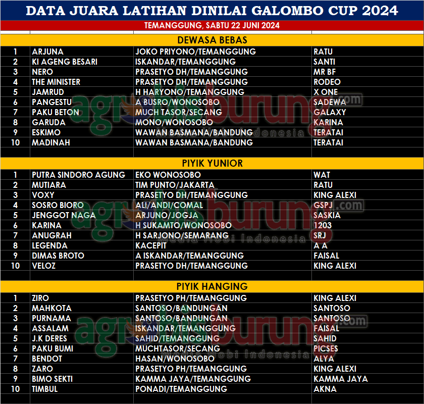 Sementara itu jalannya lomba sangat menarik, di dewasa bebas Arjuna bergelang Ratu milik Joko Priyono asal Temanggung melejit di posisi pertama setelah unggul dari Ki Ageng Besari dan Nero yang hanya berada di posisi kedua dan ketiga. Di kelas Piyik Yunior yang jadi juara terbaik pertama direbut jawara Putra Sindoro AGung bergelang WAT milik Eko Wonosobo dan yang terbaik di kelas piyik hanging direbut jawara Ziro bergelang King Alexi milik Prasetyo PH asal Temanggung.
