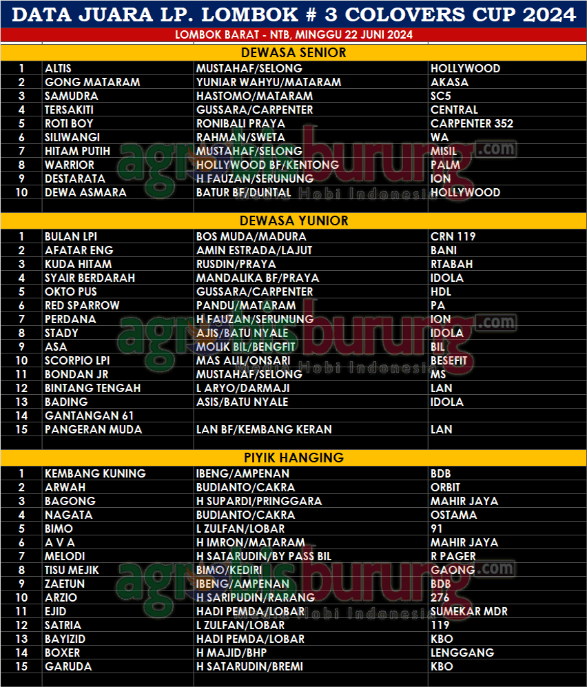 Dan dikelas piyik hanging jawara yang menjadi terbaik pertama direbut jawara Kembang Kuning bergalng BDB milik Ibeng Ampenan.