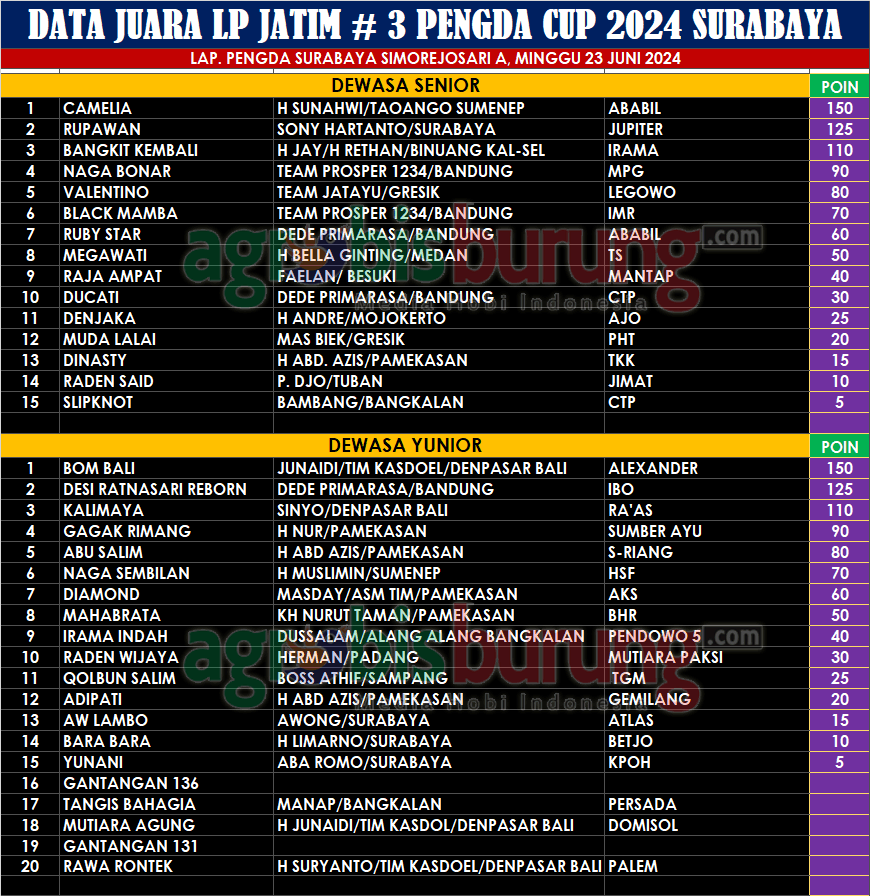 Sementara itu jalannya konkurs di masing masing kelas juga berlansgung seru, di dewasa senior jawara Camelia bergelang Ababil masih tangguh defense untuk merebut podium pertama setelah lawan lawannya kesulitan mengejar perolehan nilainya. Kemenangan ini memang membuat H Sunahwi pemilik Camelia bangga karena burung miliknya masih tangguh di level jatim dan dirinya menargetkan perolehan poin klasemen LP. Jatim 2024 akan diburunya. Rupawan bergelang Jupiter dan Bangkit Kembali bergelang Irama yang juga tampil apik harus menyerah dipodium kedua dan ketiga.