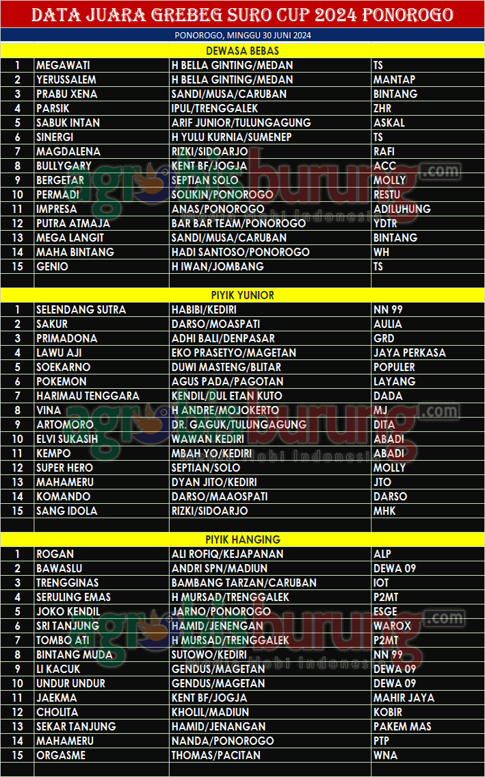 Dan di kelas piyik hanging yang jadi terbaik pertama direbut jawara Rogan bergelang ALP milik Ali Rofiq Kejapanan, disusul Bawaslu bergelang Dewa 09 dan Trengginas bergelang GRD dipodium kedua dan ketiga.