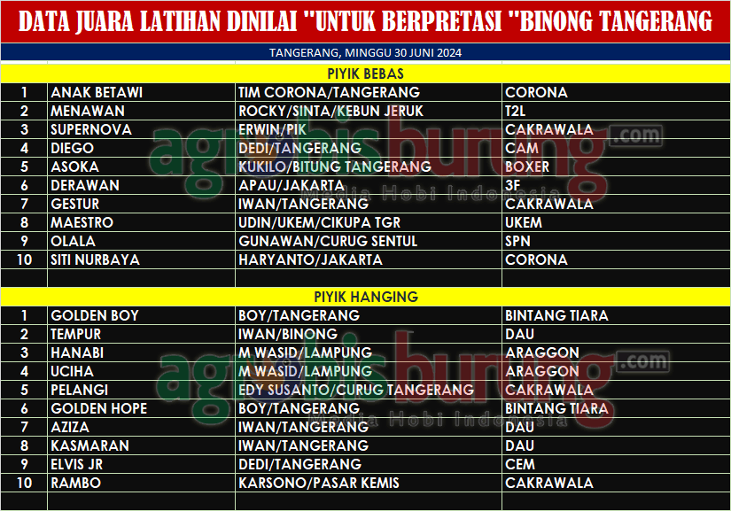 Latihan dinilai “Untuk Berpretasi” yang diusung pengcam Binong Tangerang pada gelaran Minggu (30/06) di Bird Arena Binong berjalan meriah dan menarik. Toto Rasmono, mewakili panitia mengatakan bahwa rutinnya gelaran latihan dinilai di Tangerang sangat berpengaruh terhadap hadirnya jawara jawara anyar dan berkualitas.