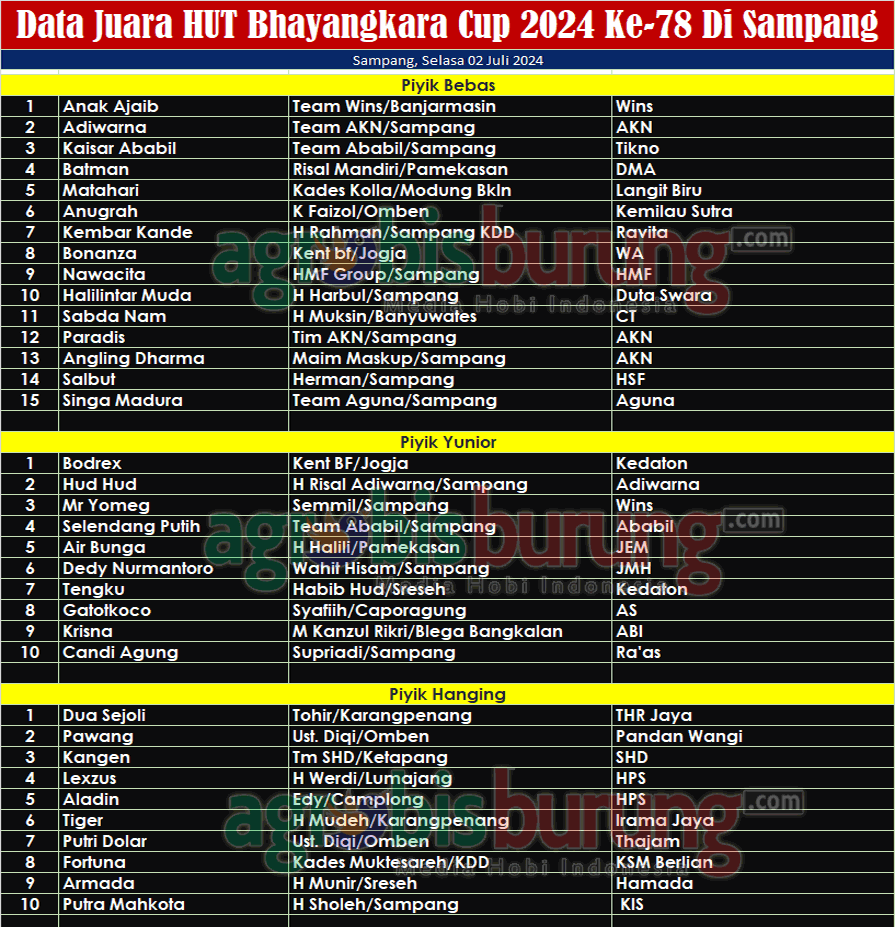 Sementara itu jalannya konkurs Bhayangkara Cup berjalan seru, di piyik bebas menampilkan jawara jawara baru yang tampil mengesankan, Anak Ajaib bergelang Wins yang dikawal Kacong benar benar tampil “ajaib” untuk merebut podium pertama. Kemenangan Anak Ajaib memang diakui Adiwarna bergelang AKN dan Kaisar Ababil bergelang Ababil yang menempati posisi kedua dan ketiga.