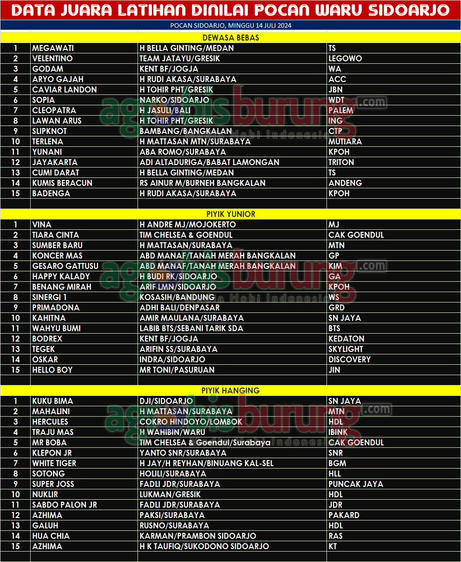 SIDOARJO, agrobisburung.com – Latihan dinilai Pocan Cobra Sidoarjo benar benar seru, semua kerekan yang ada di salah satu lapangan permanen di blok timur ini juga menolak banyak peserta. Ming Alexander, panitia mengatakan bahwa antusias ini memang luar biasa bahkan panitia harus menolak sangat banyak peserta yang mendaftar dan jalannya lomba bisa berlangsung lancar meriah dan nyaman. Adapun data juaranya sebagai berikut
