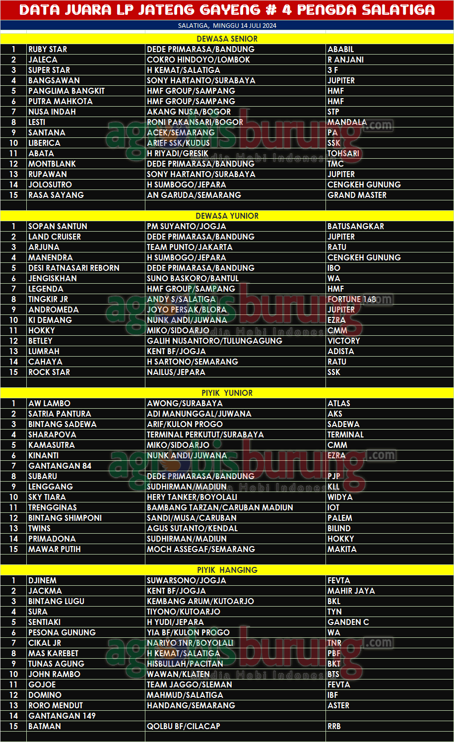 SALATIGA, agrobisburung.com – Liga Perkutut (LP) Jateng Gayeng 2024 berlabel Pengda Salatiga Cup yang berlangsung pada Minggu (14/07) menjadi agenda utama di blok tengah berjalan ramai dan seru. Jago jago terbaik di Jateng juga terlihat merapat ke Salatiga serta beberapa jawara antar blok yang sudah memiliki poin LP Jateng Gayeng ikutan hadir. Dan inilah selengkapnya Data Juara LP. Jateng Gayeng # 4 Pengda Salatiga Cup 2024, Minggu 14 Juli