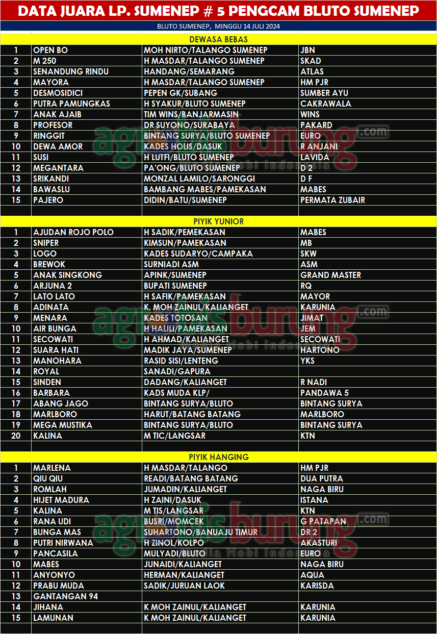Sementara hasil dari Liga perkutut di putaran 5 terlihat para juara adalah jawara terbaik di masing masing kelas, di dewasa bebas jawara Open BO bergelang JBN milik Moh Nirto asal Talango Sumenep menjadi yang terbaik pertama di kelasnya. Disusul Jawara Ajudan Rojopolo bergelang Mabes milik H Sadik Pamekasan yang merebut podium pertama di kelas piyik yunior dan yang menjadi juara terbaik pertama di kelas piyik hanging adalah jawara Marlena bergelang HM PJR milik H Masdar Talango Sumenep.