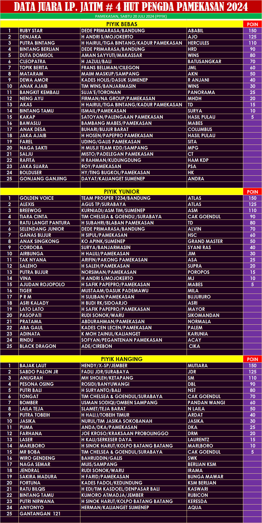 Data Juara LP. Jawa Timur # 4 HUT P3SI Pengda Pamekasan 2024, Sabtu 20 Juli (Kelas Piyik)