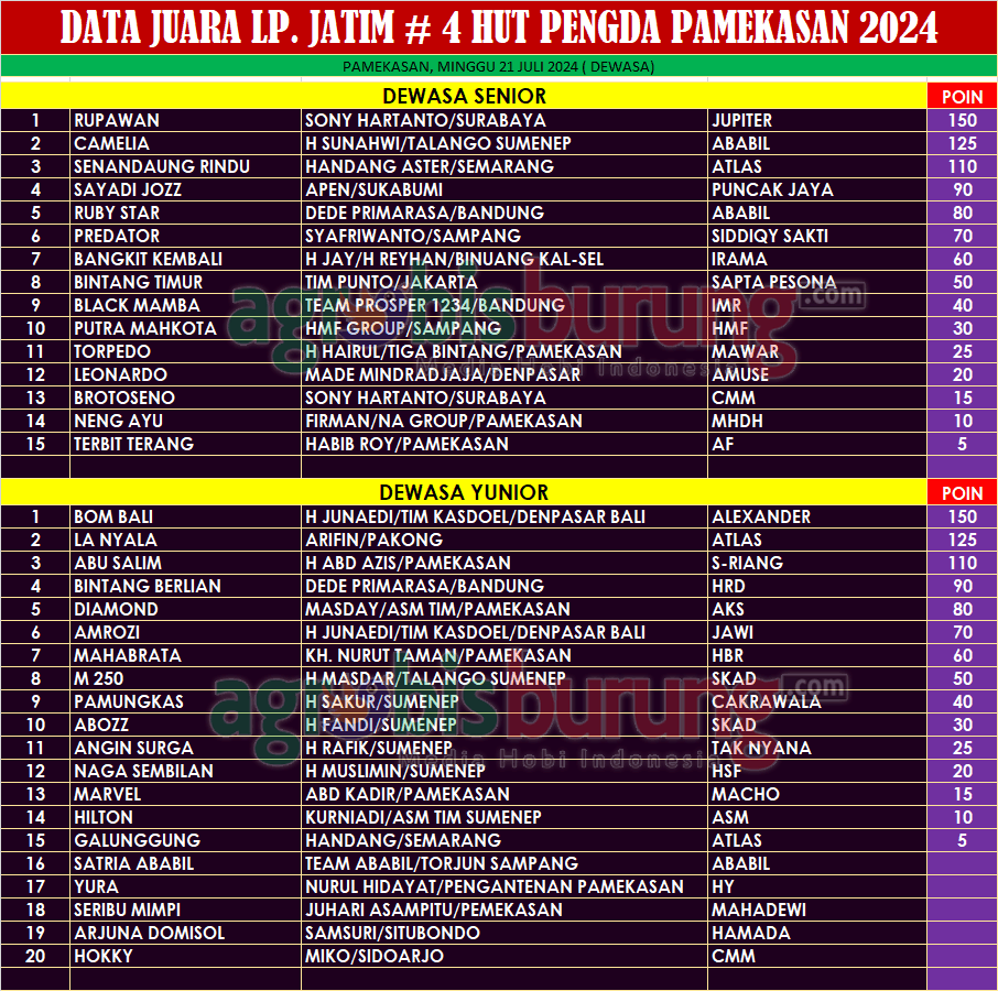 Di dewasa yunior, jawara Bom Bali bergelang Alexander milik H Junaedi dari team Kasdoel Bali juga memberikan bukti nyata bahwa tandang teamnya ke seri LP Jatim 2024 memang diimbangi dengan amunis terbaik. Dan kali ini Bom Bali di Pamekasan mampu tampil istimewa dan merebut posisi pertama, disusul La Nyala bergelang Atlas yang juga tampil istimewa merebut pdoium kedua dan posisi ketiga direbut Abu Salim bergelang S-Riang.