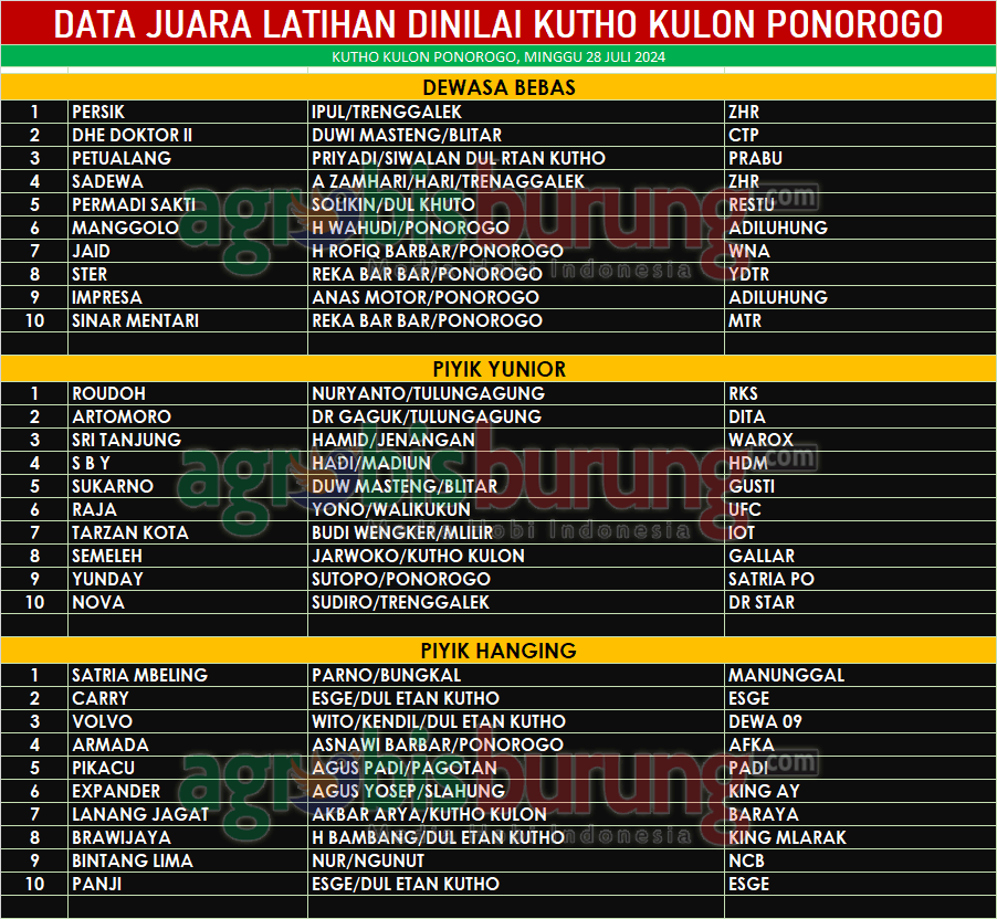 Sementara hasil kejuaraan yang dihasilkan dari pertarungan hebat selama 4 babak seru dengan jawara jawara lokal yang moncer, di dewasa bebas Jawara Persik bergelang ZHR milik Ipul Trenggalek tampil mengesankan dihadapan lawan lawannya hingga sukses merebut posisi pertama. Sehingga membuat jawara Dhe Doktor II bergelang CTP dan Petualang bergelang Prabu terpesona dan menempati posisi kedua dan ketiga.
