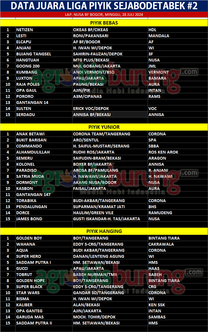 Di kelas piyik yunior, Anak Betawi andalan Corona Team Tangerang, menjadi yang terbaik setelah menyisihkan Bukit Barisan (Aron Sentul) dan Commando (H. Saiful-Mustari Serang). Sementara di kelas hanging, penerapan sistem baru teknik penancapan melahirkan jawara-jawara muda bertalenta. Diantaranya, Golden Boy (Boy Tangeraang), Wahana (Eddy S. CRG) dan Aqua (Budi-Akbar Tangerang), yang menduduki posisi 1-3.