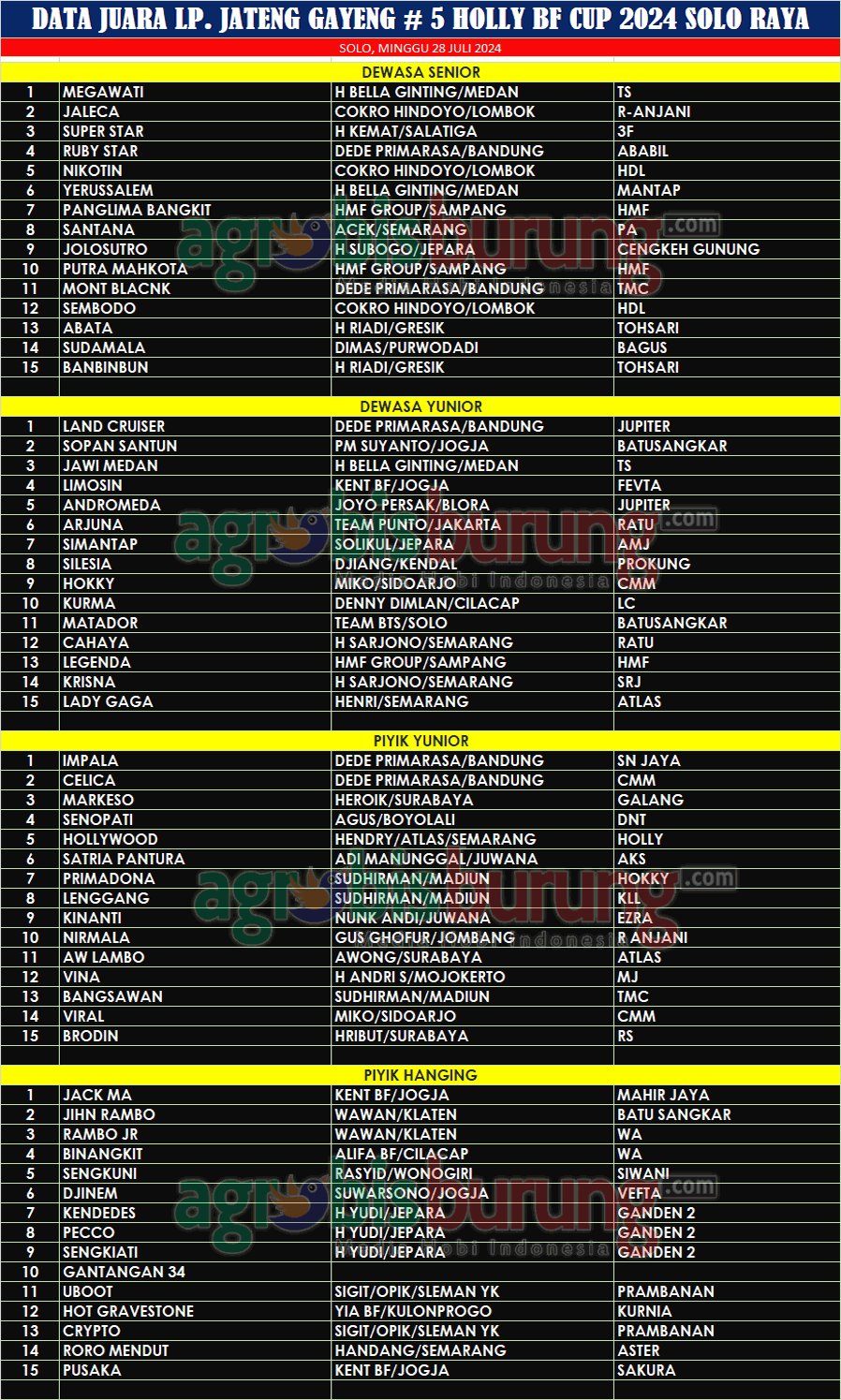 SOLO RAYA, agrobisburung.com – Seri ke-5 Liga Perkutut (LP) Jateng Gayeng 2024 akhirnya sukses di gelar Pengda Solo Raya pada Minggu (28/07), apalagi ada beberapa kungmania antar bok yang hadir dikarenakan beberapa penghuni klasemen sementara LP Jateng Gayeng pemiliknya memang dari luar Jateng. Sehingga sajian pertarungan seru sangat tampak terjadi di semua kelas. H Kemat, ketua pengwil Jawa Tengah yang hadir di LP Jateng Holly BF Cup 2024 di Solo mengatakan bahwa seri ke-5 LP Jateng Gayeng semakin seru jago jago terbaik tampil mengesankan dimasing masing kelas. Apalagi beberapa jawara antar blok “wajib” hadir dikarenakan mereka memang mengejar poin LP Jateng 2024 sehingga di seri ke-5 ini adalah mulai berburu poin sebanyak banaykanya untuk bisa bertahan diposisinya.