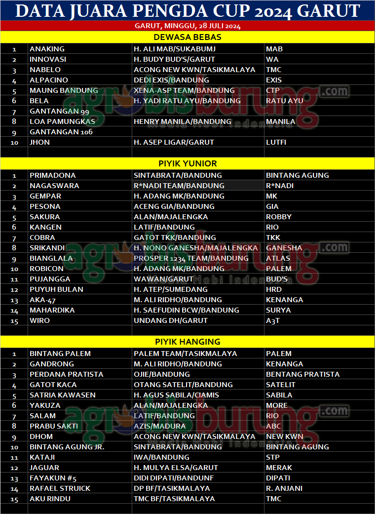 Di kelas piyik yunior, Primadona (Bintang Agung) kembali menemukan performa terbaiknya setelah sempat absen dibeberapa gelaran terakhir. Diikuti Nagaswara (R*Nadi) andalan R*Nadi Team Bandung dan Gempar (MK) andalan H. Adang Soreang, yang juga mulai menunjukkan kestabilannya. Sementara di kelas hanging, Bintang Palem orbitan anyar Abay Palem yang kembali dikawal Nardi, sukses mengawali debutnya dengan manis. Posisi kedua ditempati Gandrong (Rio) andalan M. Ali Ridho Bandung dan Perdana Pratista (BP) dan ketiga ndalan Ojie Bentang Pratista Bandung.