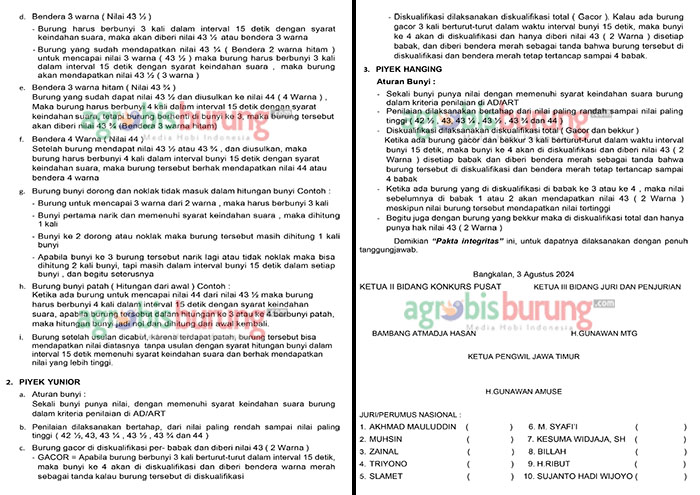 BANGKALAN, agrobisburung.com – Agenda Koordinasi & Rekonsiliasi P3SI secara nasional akhirnya sukses dilaksanakan pada Sabtu (03/08) bersamaan setelah gelaran LPI CakraAdiningrat 2024 di Bangkalan. Sesuai undangan dari PengurusP3SI Pusat perwakilan dari pengwil, tokoh dan juga korps juri hadir untuk bisa menyamakan persepsi terutama untuk tatacara penilaian konkurs. Acara yang dibuka langsung ketua umum P3SI Mayjend TNI (Purn) H Zainuri serta dimoderatori H Gunawan, ketua bindang Kejurian Pusat yang didampingi RA Mahmud, ketua bidang Peternakan P3SI Pusat.