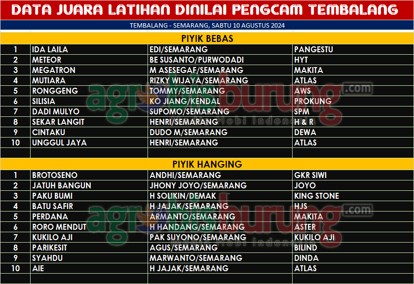Di kelas piyik hanging, debutan debutan belia asli “Semarang” tampkanya bertarung sengit, diposisi pertama yang berhasil melejit adalah jawara Brotoseno bergelang GKR Siwi. Disusul diposisi kedua ditempati jawara Jatuh Bangun bergelang Joyo dan jawara Paku Bumi bergelang King Stone diposisi ketiga.
