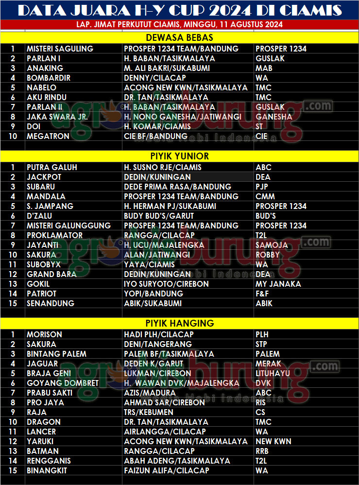 Data juara H-Y Cup 2024 Di Ciamis, Minggu 11 Agustus