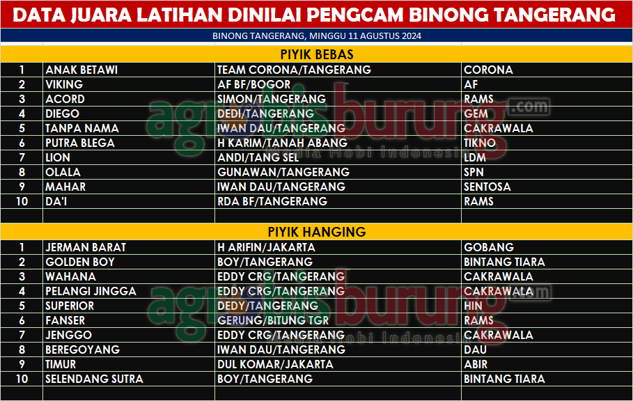 Dan di kelas piyik hanging, jawara Jerman Barat bergelang Gobang milik H Arifin Jakarta mampu mengendorkan pertahanan Golden Boy bergelang Bintang Tiga dan Wahana bergelang Cakrawala untuk merebut posisi terbaik pertama. Dan di babak akhir kedua lawan seterunya itu Golden Boy menempati posisi kedua dan    Wahana diposisi ketiga.