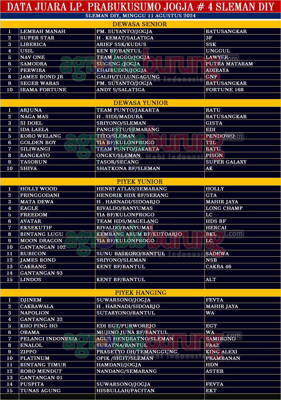 Adalah jawara Arjuna (Ratu) burung jagoan milik Team Punto, yang turun di kelas Dewasa Yunior, dengan tetaten mampu meladeni perlawanan rival-rivalnya dan suskses menyandang predikat “terbaik” di kelas ini. Sebagai runner up adalah Naga Mas ( Batusangkar) milik H Sidi, dan Si Doel (Gista) jagoan milik Sriyono bercokol di posisi ke 3.