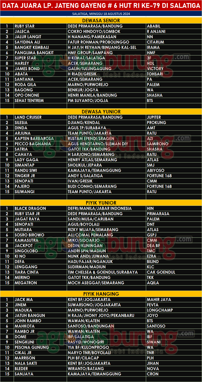 Sementara itu jalannya lomba sangat menarik, di dewasa senior jawara gaek Ruby Star bergelang Ababil milik Dede Primarasa Bandung masih menguasai jalur juaranya. Dan keberhasilan di Salatiga semakin menambah pundi pundi poin untuk memperkuat perolehan poin terbaik di Klasemen Liga Jateng gayeng 2024. Diposisi kedua dikuasai Jaleca bergelang R Anjani dan di posisi ketiga direbut jawara Jalur Langit bergelang NN.