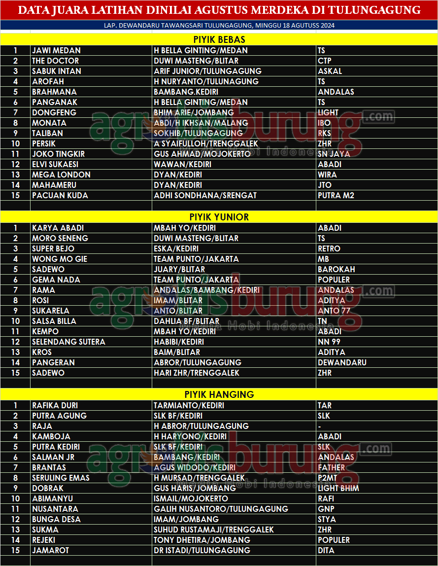 Di kelas piyik hanging yang jadi terbaik pertama adalah jawara Rafika Duri bergelang Tar milik Tarminato Kediri. Dan diakhir acara panitia mengucapkan terima kasih atas kehadiran kungmania dari berbagai daerah, Paniti ajuga mohon maaf jika dalam pelayanan dan penyajian lomba masih ada kekurangan.