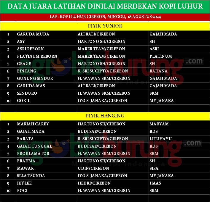 Kali ini, penguasa di kelas piyik yunior dan hanging masih diisi muka lama, yakni Garuda Muda dan Mariah Carey. Namun, banyak juga jago-jago baru bermunculan. Diantaranya, Asri Reborn dan Platinum Reborn dua andalan tim debutan MaBer Team Cirebon, yang meraih juara 3 dan 4 piyik yunior. Kemudian, Asy dan Grage dua orbitan anyar Hartono SH Cirebon yang meraih juara dan 5 piyik yunior.