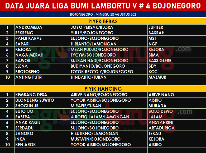 Sementara itu jalannya liga tetap penuh persaingan sengit di dua kelas yang dimainkan, di piyik bebas jawra Andromeda bergelang Jupiter milik Joyo Persik Blora dengan kemampuan hebatnya bisa mencuri poin kemenangan dari lawan lawannya. Sekreng bergelang BAsrah dan Paji Karas bergelang MST yang sempat mengimbangi aksi Andromeda harus mengakui kehebatannya dan menempati posisi kedua dan ketiga di babak akhir.