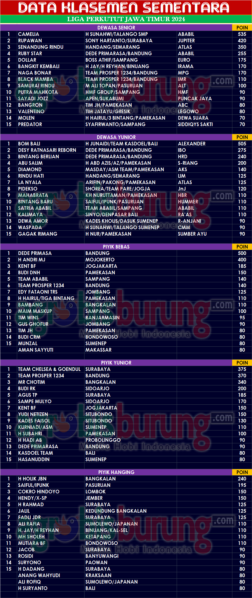 Jelang LP. Jatim #5 ini, pengwil Jatim merilis data jawara penghuni klasemen sementara LP Jatim 2024 yang dihasilkan dari 4 seri sebelumnya, di dewasa senior jawara Camelia (535) bergelang Ababil milik H Sunahwi asal Talango Sumenep mempimpin posisi pertama. Disusul jawara Rupawan (420) diposisi kedua dan posisi ketiga di tempati Senandung Rindu (350) bergelang Atlas.