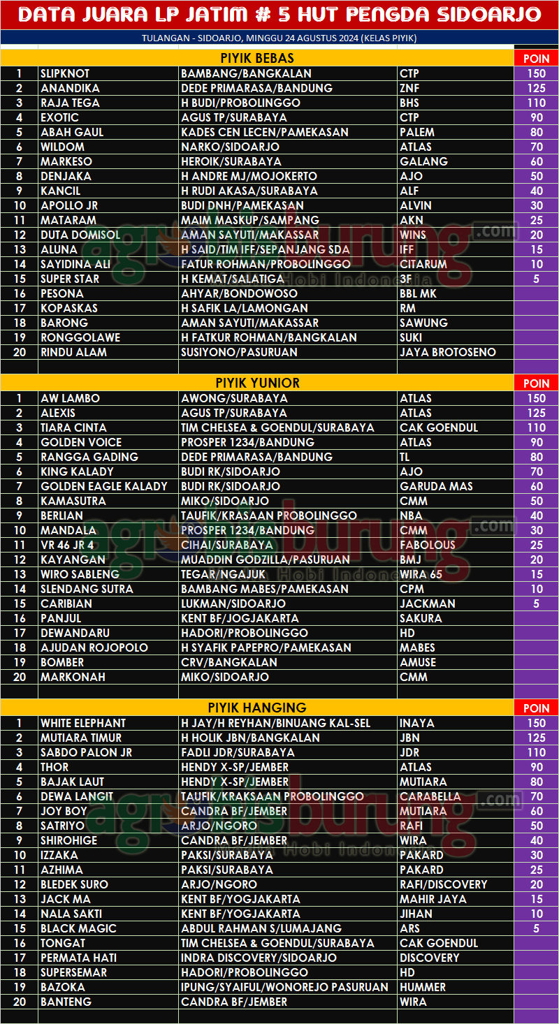 Dan di kelas piyik hanging, debutan belia White Elephant bergelang Inaya milik H Jay/H Reyhan asal Binuang Kalimantan Selatan yang dikawal Abah Atro dan Team BGM kembali sukses mengantarkan jawara terbaik teamnya merebut mahkota juara pertama atas lawan lawannya. Perlawanan dua seterunya Mutiara Timur bergelang JBN dan Sabda Palon JR bergelang JDR yang gencar tak menyusutkan tampilan terbaik White Elephant merebut yang terbaik dan keduanya harus mengunci posisi kedua dan ketiga setelha White Elephant bertenghger diposisi pertama.