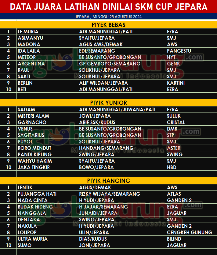 Di kelas piyik yunior, debutan muda Sadam bereglang Ezra lagi lagi jadi terbaik pertama di kelasnya, Sadam dengan hebatnya mematahkan setiap pukulan dari lawan lawan beratnya. Dan dibabak penentuan Misteri Alam bergelang Suluk serta Garnacho bergelang Cristal menempati posisi kedua dan ketiga. Dan di kelas piyik hanging yang jadi terbaik pertama direbut oleh jawara bernama Lentik bergelang AWS milik agus Demak.