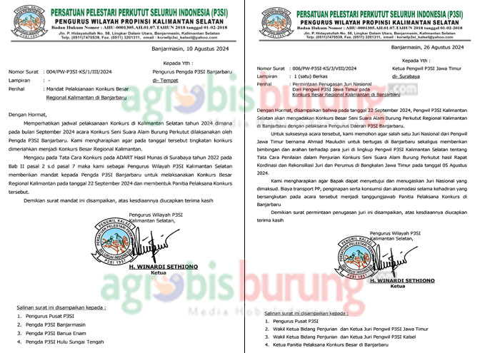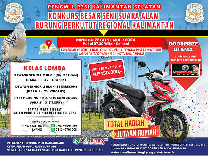 BANJARBARU, agrobisburung.com – Salah satu kegiatan Konkurs di Kalimantan Selatan tahun 2024 yang di agendakan Pengurus Wilayah P3SI Kalimantan Selatan yang di komandani H. Winardi Sethiono sejak terpilih sebagai ketua dari hasil Muswil Kalimantan Selatan (22/12/23) lalu adalah gelaran rutin konkurs baik itu skala regional, besar ataupun nasional/LPI. Dan komitmen tersebut sudah berjalan dan jelang konkurs besar tersebut yang tertuang pada surat nomor 004/PW-P3SI-KS/1/III/2024 tanggal, 10 Agustus 2024 tentang Pelaksanaan Konkurs Besar Regional Kalimantan di Banjarbaru siap dilaksanakan pada Minggu 22 September mendatang.