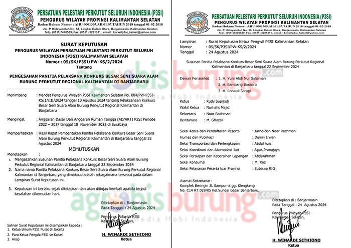 Dengan mengacu surat tersebut pada Jumat (23/08) langsung digelar dan dibentuk kepanitian untuk mengcaver kegiatan tersebut sebagiamana dalam surat SK Nomor 05/SK/P3SI/PW-KS/2/2024 tanggal 24 Agustus 2024. Dengan mengantongi Surat Keputusan tersebut maka pihak Pengurus Daerah P3SI Banjarbaru berupaya melaksanakan event Regional Kalimantan dengan membuka 3 (tiga) kelas yaitu Dewasa Senior : 2 blok (84 kerekan), Dewasa Junior : 2 blok (84 kerekan) dan kelas Piyek hanging : 1 blok (40 gantungan)