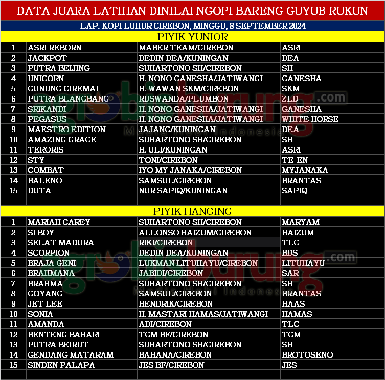 Data Juara Latihan Dinilai Ngopi Bareng Guyub Rukun di Cirebon, Minggu 08 September